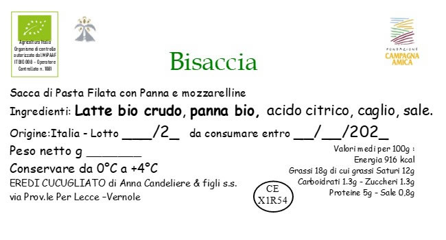La bisaccia è un “sacchetto” di pasta filata ripieno di panna e Ciliegine, ragguardevole reinterpretazione della burrata. Un prodotto caseario fresco, dalla forma sferoidale con una doppia struttura, di colore bianco lucente.