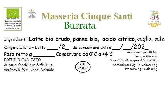 All’interno del variegato mondo dei latticini freschi, la burrata è quel prodotto caseario fresco, a pasta filata, cruda e molle, da latte vaccino, crudo, intero. È uno dei più famosi formaggi pugliesi che si differenzia dagli altri per la sua particolare tecnica di lavorazione e per le sue caratteristiche organolettiche che lo rendono uno dei prodotti più pregiati del mezzogiorno d’ Italia. Prodotto di forma sferoidale con una doppia struttura: un “sacchetto” di mozzarella, di colore bianco che contiene un morbido cuore di “sfilacci” di pasta filata a cui viene aggiunta la panna; il tutto chiamato “Stracciatella”.