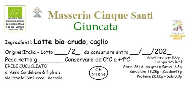 Formaggio fresco a pasta molle e cruda, privo di crosta, uno dei più antichi della Puglia. La Giuncata era già conosciuta nel Medioevo, quando le vacche, non venivano impiegate per un vero e proprio allevamento, pascolavano libere nelle campagne e il latte che si mungeva veniva miscelato e coagulato con caglio vegetale ricavato dal lattice di fico. La cagliata appena estratta è posta su fascere di giunco da cui ha preso il nome, ha forma fusiforme ed è priva di sale e va consumata entro due giorni massimo dalla produzione. Ha consistenza molto morbida, con pasta di colore bianco, dal gusto delicato, essenzialmente di latte.