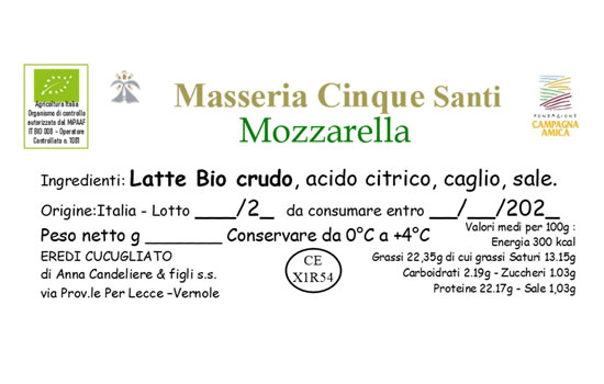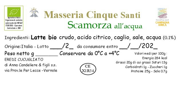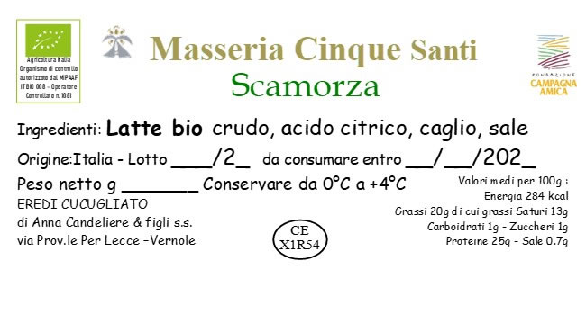 È un formaggio a pasta filata “fresca” senza crosta, ottenuta da latte di vacca intero e crudo, di forma ovale con testina legata con un laccetto.La superficie bianco-porcellanato, con una pelle liscia e sottile. La scamorza ha struttura a foglie sottili e omogenee, compatta, morbida, leggermente elastica. È un formaggio da consumare fresco entro 48 ore dalla produzione.Il sapore ricorda una fresca combinazione tra mozzarella e altri latticini freschi .La particolarità di questa lavorazione a latte crudo è che il sale non viene per assorbimento in salamoia, come si fa con le normali paste filate, bensì viene aggiunto in fase di filatura.