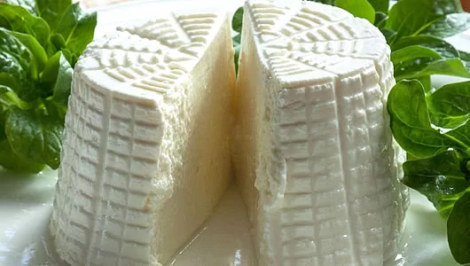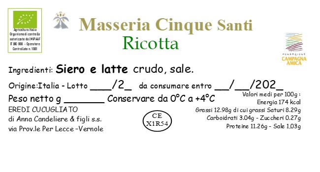 la ricotta è un latticino fresco dalla texture soffice e cremosa, con spiccati aromi di panna e latte cotto. La crosta è assente, la pasta è di colore bianco-latte con struttura poco consistente, sierosa, adesiva e morbida. Il nome deriva dal latino recocta, cioè cotta due volte, in quanto ottenuta dal riscaldamento del siero residuale della coagulazione del formaggio. Le sue origini storiche si possono datare all’epoca della civiltà greco-romana.