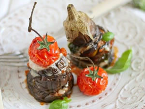 Prendete una teglia, foderatela con carta forno e preparatevi a comporre le vostre piccole parmigiane. Iniziate con un disco di melanzana, spennellatela con abbondante salsina al basilico, quindi poggiatevi sopra alcune fettina di pomodorino. Grattugiatevi generosamente sopra la Ricotta Marzotica e ricoprite con un altro disco di melanzana. Ancora salsa al basilico e quindi pomodorino. Altra grattugiata di Ricotta Marzotica e grattata di pepe finale.