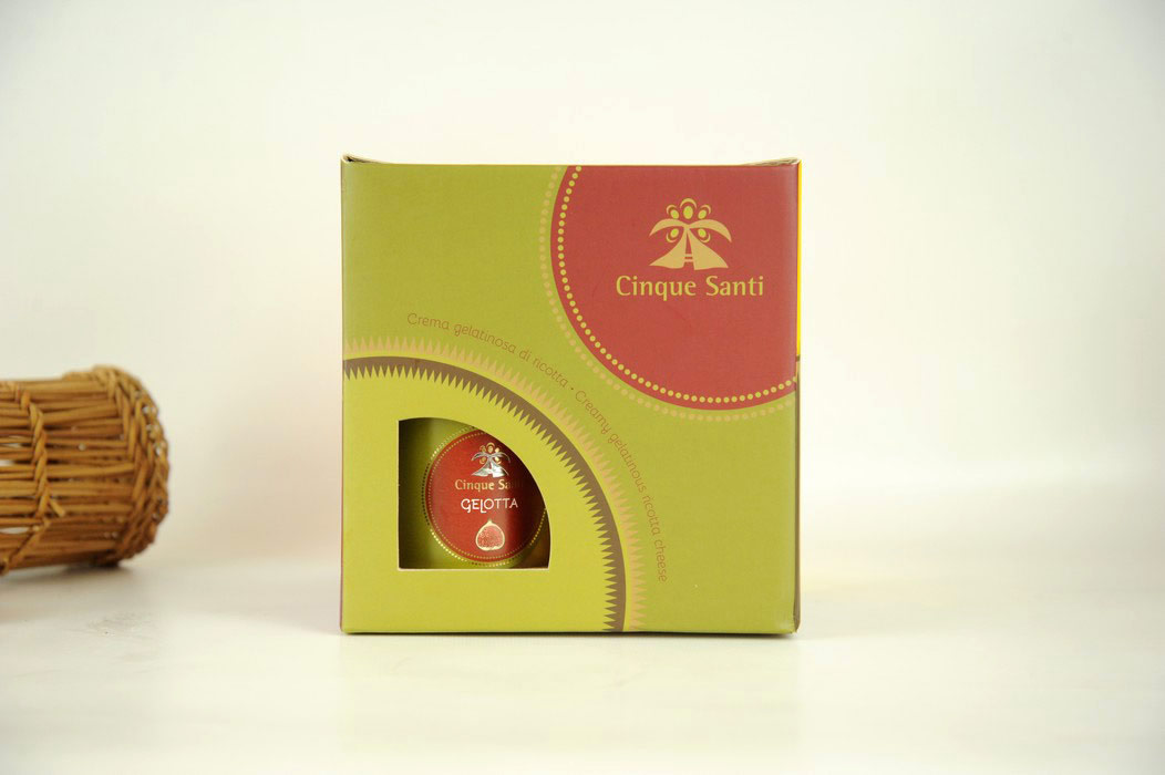 Cofanetto “Cinque Santi“ quattro colori per quattro delizie con tre vasi di Gelotte ed un vaso di Ricottina alle Oliva Cellina di Nardò.
